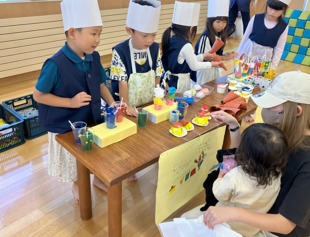 お店屋さんはデザート屋さんやお祭りの屋台など様々です。各店エプロンや帽子をかぶり、「いらっしゃいませー!」とはりきってお客さんの呼び込みをしていました。